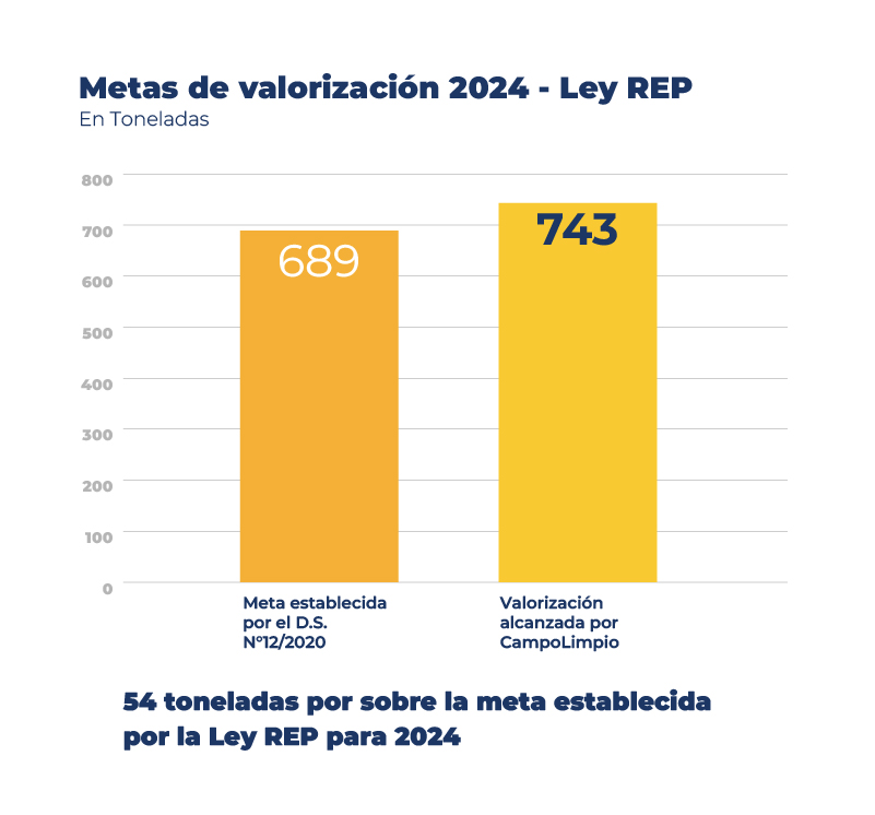 El Sistema de Gestión CampoLimpio reportó una valorización de 743 toneladas, superando la meta oficial de 689 toneladas fijada por el Decreto Supremo N°12/2020. A este resultado se suma el aporte del programa voluntario, mediante el cual se valorizaron 673 toneladas adicionales de envases plásticos y metálicos, consolidando la transición hacia un modelo regulado por la Ley REP.