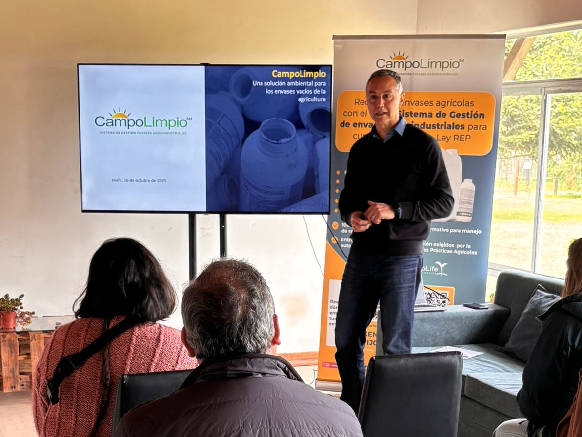 En el Centro de Innovación y Capacitación (CIC) Los Ríos se realizó una jornada de capacitación sobre manejo responsable de envases de agroquímicos y la técnica del triple lavado, a cargo de Eduardo Araneda, Zonal Sur de CampoLimpio.
