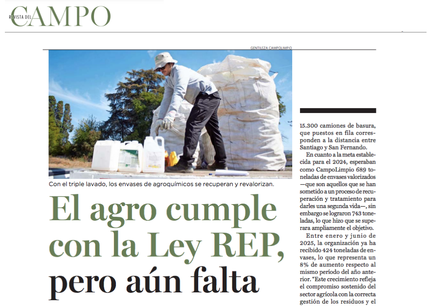 Por otra parte, la directora ejecutiva de CampoLimpio hace alusión a la comunicación hacia los productores que es sumamente importante, dice, para que puedan seguir las exigencias de la ley, con sus actualizaciones, ya que si bien son prácticas que se llevan a cabo hace un tiempo, hay ciertos requisitos que no se cumplen del todo por desconocimiento. “Aunque la práctica del triple lavado está instaurada hace años, aún no toda la comunidad agrícola la conoce ni sabe dónde entregar los envases una vez lavados. Difundir esta información es esencial, ya que el triple lavado permite que los envases sean clasificados como residuos no peligrosos y, por tanto, puedan reciclarse. En ese sentido, la educación y la difusión constante son claves para cerrar correctamente el ciclo de gestión que promueve la Ley REP”, afirma Francisca Gebauer.