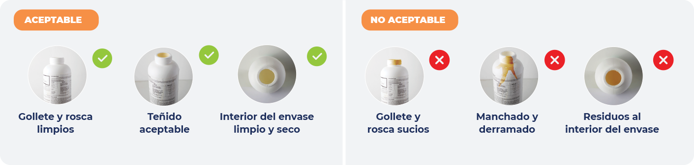 Para asegurar una correcta gestión y reciclaje, es importante que los envases entregados en los centros fijos y puntos móviles de CampoLimpio cumplan con los siguientes requisitos: